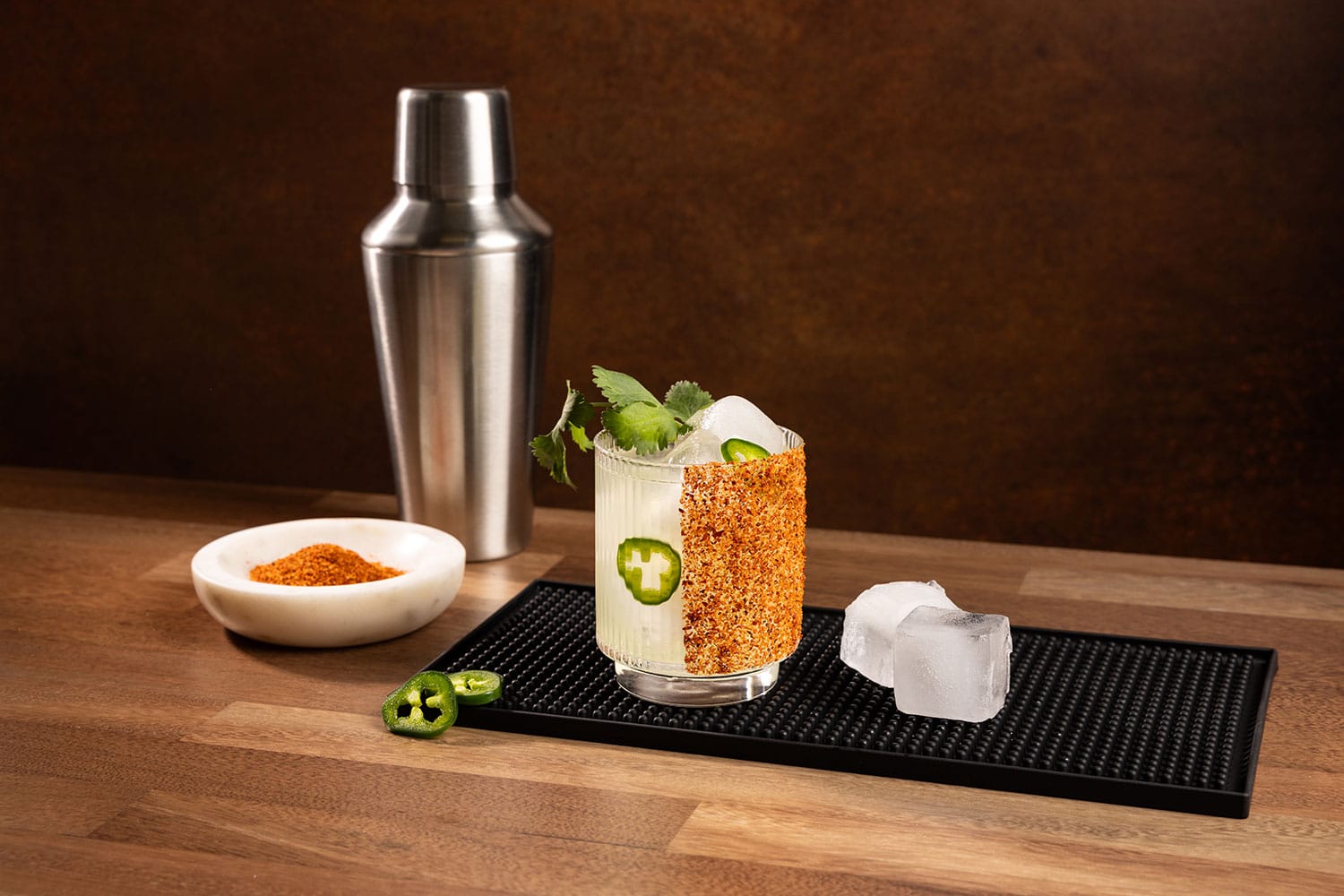 - In a shaker, muddle the jalapeño slices with lime juice to release the heat and flavor.