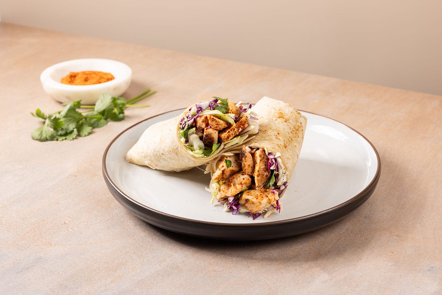 - Warm tortilla, then layer with lettuce, cabbage, and seasoned chicken.