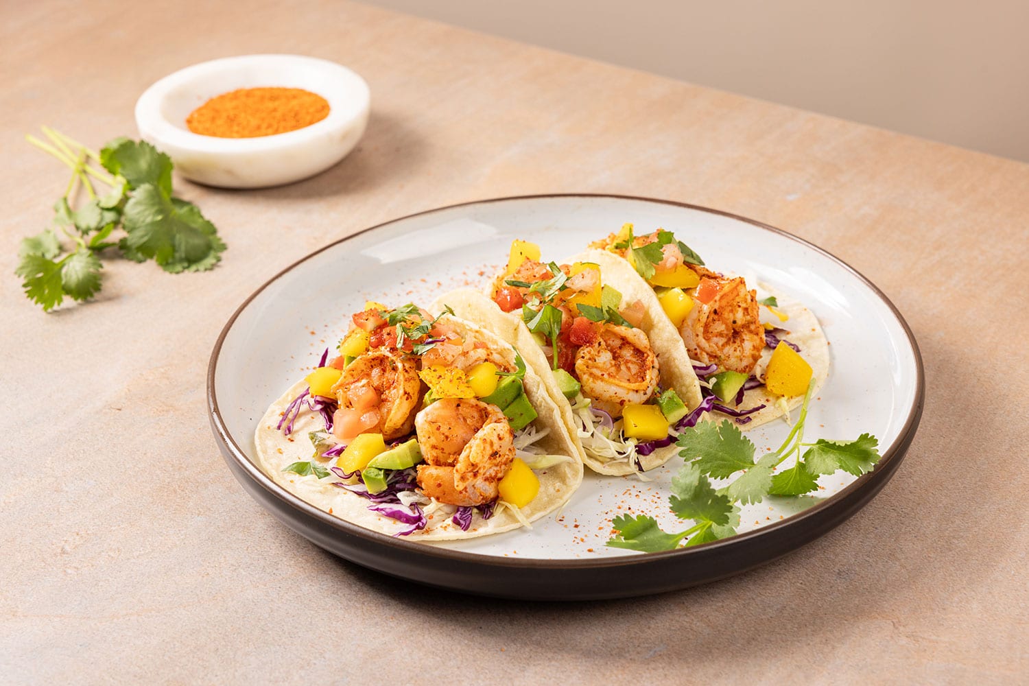 - Warm tortillas. Assemble each taco with cabbage, lettuce, tomato, avocado slices, mango, and cooked shrimp.
